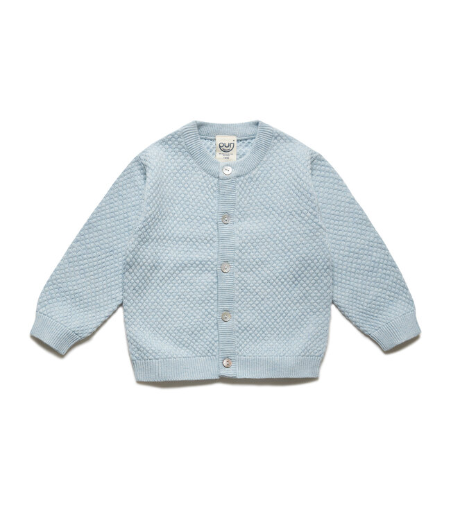 Het verfijnde structuurbreisel en de klassieke knoopsluiting geven het een tijdloze uitstraling, terwijl de elastische ribboorden zorgen dat het kledingstuk perfect in model blijft. Een duurzaam en eerlijk geproduceerd basisstuk in zacht lichtblauw, ontworpen met liefde voor de gevoelige babyhuid en de planeet.