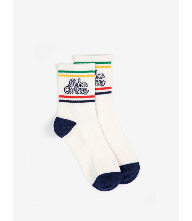 Voeg een sportieve en vrolijke touch toe aan elke stap met de By Hand short socks. Deze sokken op een zachte ecru basis vallen op door de kleurrijke horizontale strepen in groen, geel, rood en navy. Op de zijkant prijkt het herkenbare Bobo Choses-logo in een klassieke navy kleur, die ook terugkomt in de contrasterende hiel en teen. Vervaardigd van een hoogwaardige katoenmix met een fijne ribstructuur aan de bovenzijde, blijven deze sokken de hele dag goed en comfortabel zitten. Een veelzijdig accessoire dat perfect past bij sneakers en elke zomerse outfit een speels accent geeft.