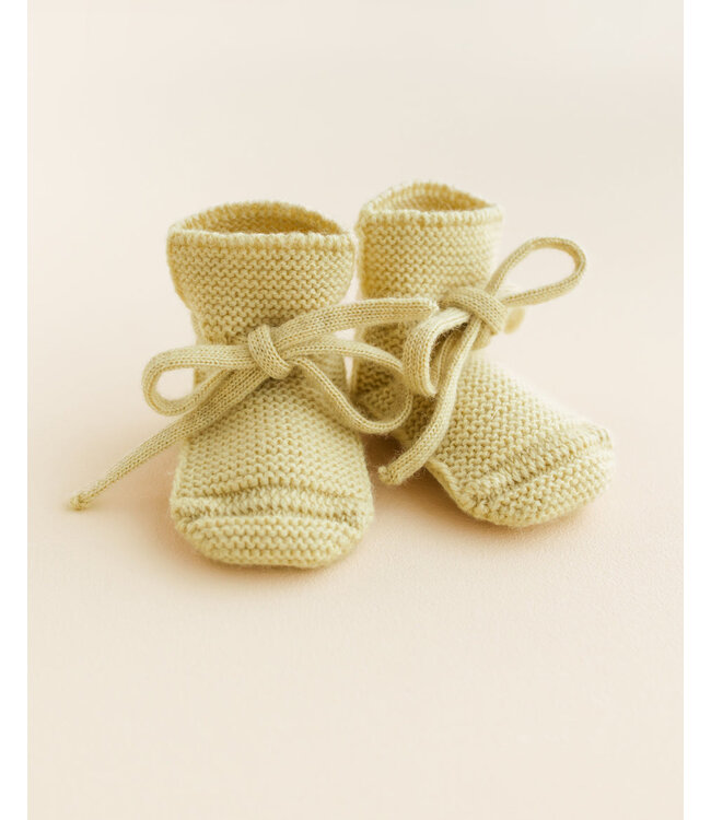 Deze Knit baby booties van Hvid staan bekend om hun uitstekende pasvorm. Dankzij het unieke ontwerp bij de hiel en de aangenaaide veters blijven de slofjes stevig aan de babyvoetjes zitten. De naadloos gebreide merinowol is temperatuurregulerend, waardoor de voetjes in elk seizoen comfortabel warm blijven zonder te oververhitten. De slofjes worden geleverd in een charmant katoenen zakje, wat ze ideaal maakt als duurzaam kraamcadeau.