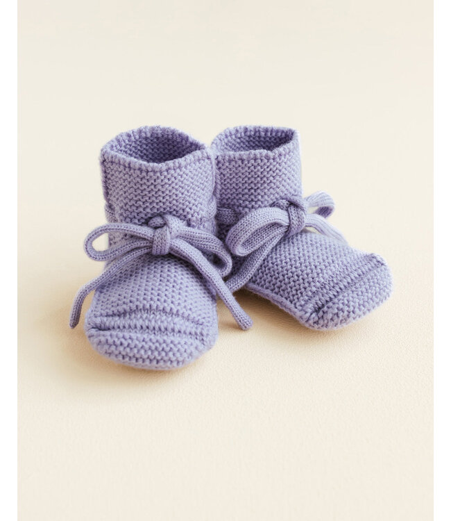 Deze Knit baby booties van Hvid staan bekend om hun uitstekende pasvorm. Dankzij het unieke ontwerp bij de hiel en de aangenaaide veters blijven de slofjes stevig aan de babyvoetjes zitten. De naadloos gebreide merinowol is temperatuurregulerend, waardoor de voetjes in elk seizoen comfortabel warm blijven zonder te oververhitten. De slofjes worden geleverd in een charmant katoenen zakje, wat ze ideaal maakt als duurzaam kraamcadeau.