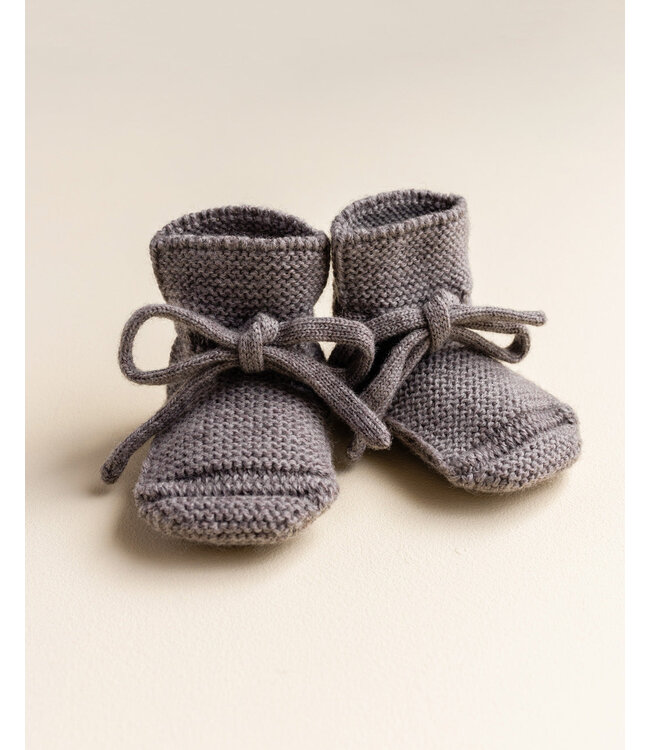 Deze Knit baby booties van Hvid staan bekend om hun uitstekende pasvorm. Dankzij het unieke ontwerp bij de hiel en de aangenaaide veters blijven de slofjes stevig aan de babyvoetjes zitten. De naadloos gebreide merinowol is temperatuurregulerend, waardoor de voetjes in elk seizoen comfortabel warm blijven zonder te oververhitten. De slofjes worden geleverd in een charmant katoenen zakje, wat ze ideaal maakt als duurzaam kraamcadeau.
