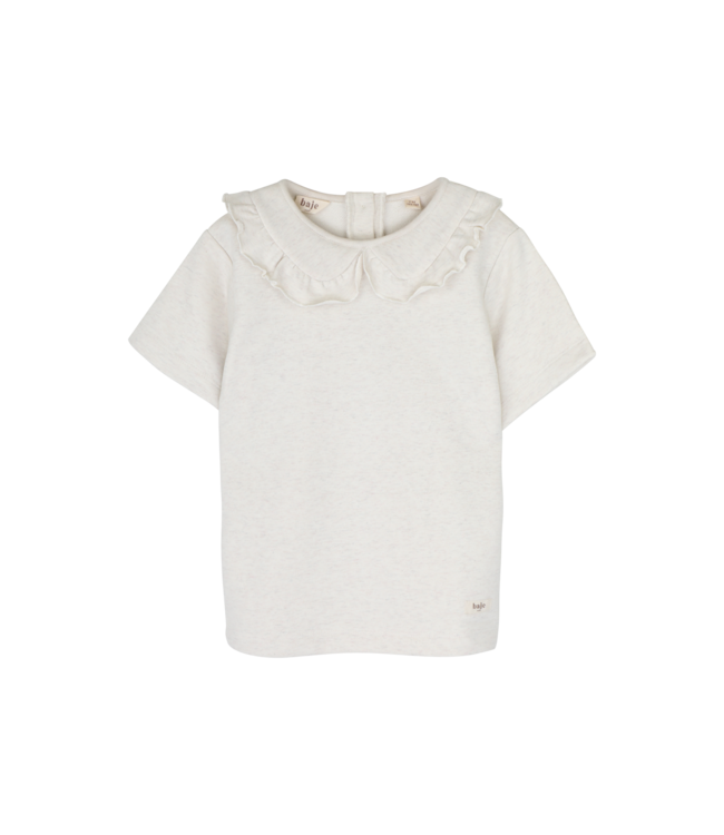 De Francia shortsleeve is een verfijnde klassieker die comfort en stijl moeiteloos samenbrengt. Gemaakt van een hoogwaardige, zachte stof in een rustige creme melange tint, biedt dit shirt een heerlijke pasvorm voor de hele dag. De eyecatcher van dit ontwerp is de elegante kraag met subtiele ruffles, die elk outfit direct een luxe uitstraling geeft. Dankzij de handige drukknoopjes op de rug is het aan- en uitkleden zeer eenvoudig. Een veelzijdig item dat prachtig staat bij zowel een casual broekje als een feestelijk rokje.