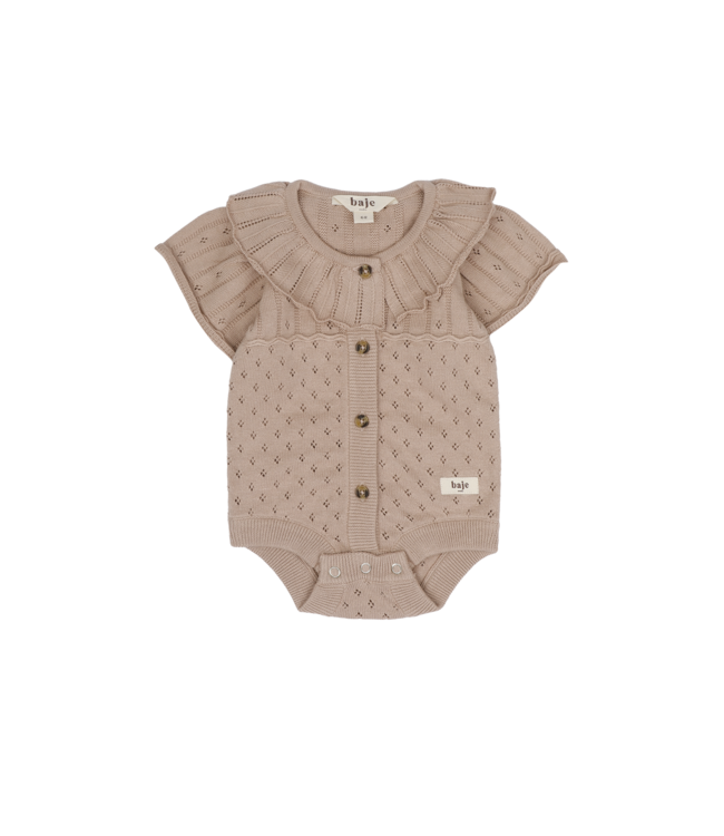 Deze gebreide baby romper met ruffles is een prachtig item voor elke gelegenheid. Het verfijnde ajourpatroon geeft de romper een luxe, klassieke touch, terwijl de zachte kraag zorgt voor een lieflijk detail. De ademende knitwear is warm maar toch luchtig, waardoor je mini altijd op de juiste temperatuur blijft. Dankzij de praktische drukknoopjes aan de onderzijde is ook verschonen zeer eenvoudig. Een comfortabel en stijlvol kledingstuk dat perfect past in een tijdloze babygarderobe.
