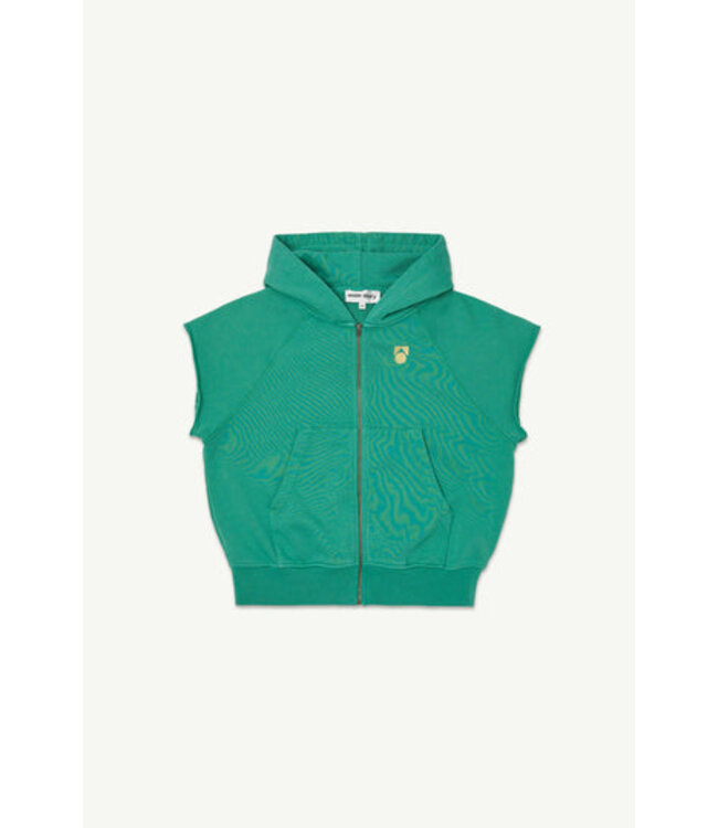 Deze mouwloze hoodie met rits in de kleur Bottle Green is vervaardigd van een zachte, organische katoenen diagonaal jersey fleece. Het ontwerp heeft een ruime pasvorm met raglanmouwen die zijn voorzien van een onafgewerkte rand voor een ontspannen uitstraling. De hoodie is uitgerust met een dubbellaagse capuchon en een geribde zoom aan de onderzijde. Door de garment-dye techniek voelt het materiaal extra zacht aan op de huid en krijgt het kledingstuk een unieke kleurintensiteit. De hooded tank is afgewerkt met een geborduurd logo en is verantwoord geproduceerd in Portugal van 100% biologisch katoen.