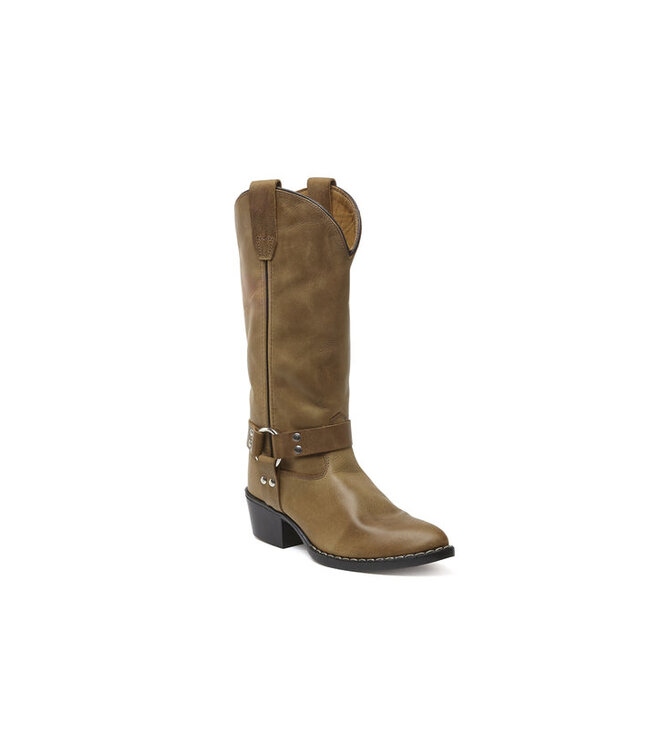 De Jacky Camel High Kids van Bootstock is de perfecte keuze voor kinderen die houden van een look met een rauw randje. Deze hoge laarzen zijn uitgevoerd in een prachtige camelkleur en vallen direct op door de afneembare lederen band rond de wreef, versierd met robuuste zilverkleurige ringen en studs. Dit geeft de klassieke western boot een stoere biker-vibe.