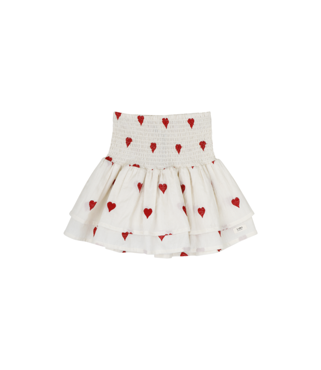 De Lana rok is een echte blikvanger met speelse rode hartjes, een comfortabele gesmokte taille en luchtige laagjes. Perfect te combineren met de Loe of Lymee blouse voor een complete, romantische look, of draag haar met een basic tee voor een casual twist. Vervaardigd van 100% katoen voor een fijn draagcomfort.