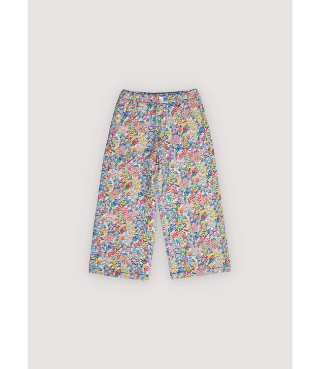 Deze prachtige wide leg denim combineert een vintage look met modern comfort. De broek valt op door de gedetailleerde bloemenprint en de klassieke rechte pijpen, uitgevoerd in hoogwaardig 100% BCI-katoen. Dankzij de verstelbare tailleband met elastiek aan de binnenzijde sluit de broek altijd perfect aan bij je kindje. Met handige zakken aan de voor- en achterkant en een subtiel geborduurd detail op de achterzijde is dit een uniek item dat elke outfit een vrolijke en bewuste touch geeft.