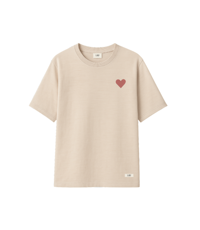 De Liza top: een zachte, minimalistische 100% katoenen basic met een subtiel hartje op de borst. Tijdloos, comfortabel en perfect om elke outfit een lieve touch te geven. Een essentieel item.
