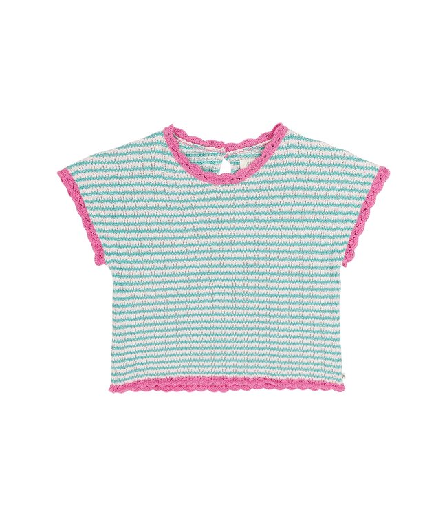 De Knitted stripe top is vervaardigd van 100% biologisch katoen in een zachte, gebreide kwaliteit. De top is uitgevoerd in een charmant horizontaal streeppatroon en is aan de achterzijde voorzien van een praktische sluiting. Het ontwerp is gedetailleerd afgewerkt met een sierlijke 'fancy' rand langs de halslijn, de mouwgaten en de onderste zoom. Een comfortabel en verfijnd kledingstuk voor elke dag.