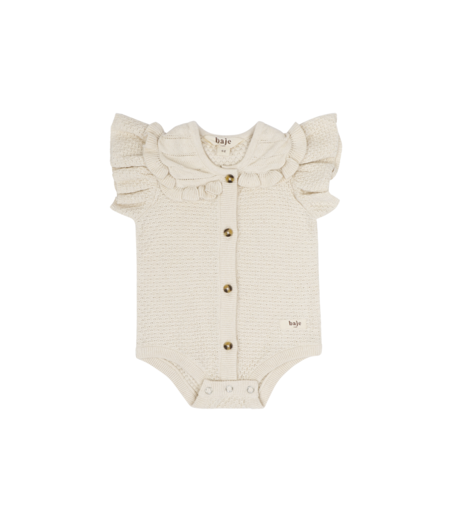 Deze gebreide baby romper met ruffles is de perfecte keuze voor zowel speciale gelegenheden als dagelijks gebruik. Het verfijnde ajourpatroon geeft het item een luxe uitstraling, terwijl de korte mouwtjes en de ademende knitwear zorgen dat de romper warm maar toch luchtig aanvoelt. Dankzij de flexibele pasvorm heeft je kleintje alle bewegingsvrijheid. Een stijlvol en praktisch kledingstuk dat prachtig staat onder een vestje of simpelweg als blikvanger op een zonnige dag.