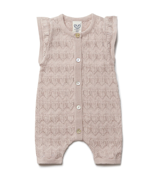 Het ontwerp valt op door de speelse roezelmouwtjes en de knoopjes die over de hele lengte lopen. Hierdoor kun je je kleintje makkelijk aan- en uitkleden. In de kleur Cameo Rose is dit een duurzaam en eerlijk gemaakt kledingstuk dat comfort en een tijdloze stijl mooi combineert.