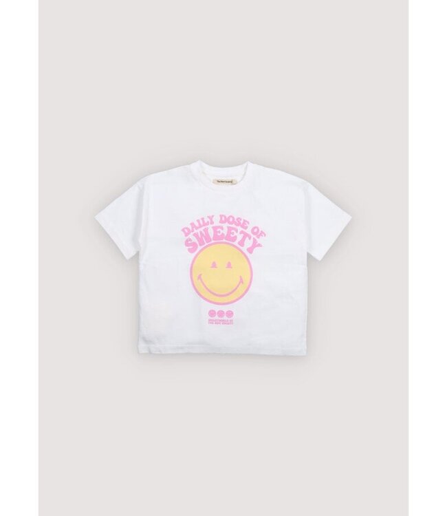 Een fris wit T-shirt is een echte essential, zeker met de iconische smiley in een vrolijke geel-roze kleurcombinatie. Dit shirt van The New Society heeft een comfortabele pasvorm en is vervaardigd van hoogwaardig katoen dat ademt en zacht aanvoelt. Of je het nu combineert met een stoere denim of een kleurrijke short, dit item zorgt voor een glimlach bij elke outfit. Een perfecte mix van een tijdloze basis en een speels detail voor elke kleine avonturier.