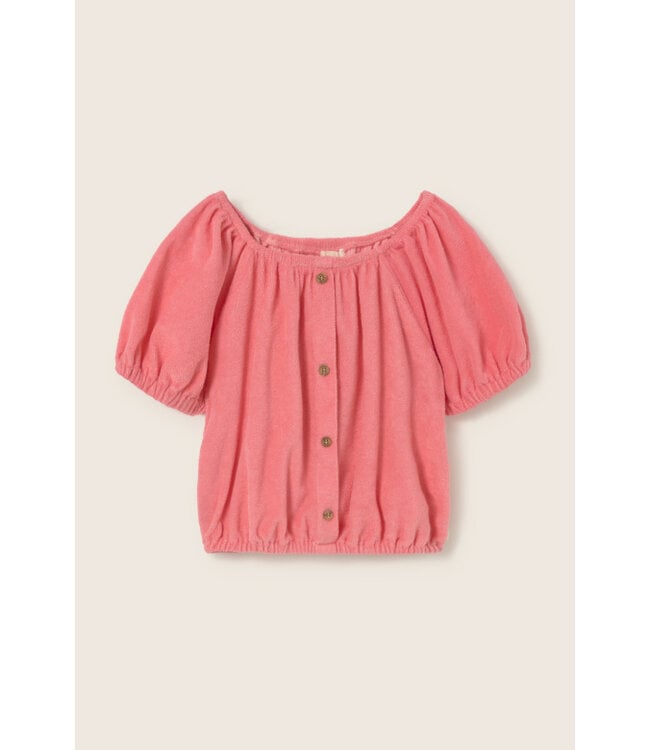 Deze top uit onze terry-collectie combineert ultiem comfort met een eigentijdse look. De fluffy badstof voelt heerlijk zacht en luxueus aan op de huid, wat het een favoriet maakt voor warme dagen. Dankzij de elastische afwerking bij de boothals, de korte mouwen en de zoom heeft de top een perfecte pasvorm die mooi aansluit. Het cropped silhouette geeft het item een moderne twist, terwijl de decoratieve knoopsluiting aan de voorzijde zorgt voor een verfijnd detail. Of het nu gedragen wordt naar het strand of tijdens een zomerse wandeling, deze top biedt een luchtige en stijlvolle uitstraling voor elke gelegenheid.