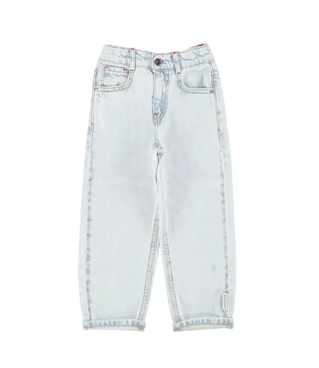 Deze unisex denim broek in een frisse gewassen lichtblauwe kleur is een onmisbare klassieker voor de SS26-collectie. De verstelbare taille zorgt voor een optimale pasvorm en comfort, terwijl het subtiele rode logo-borduursel op één van de achterzakken een karakteristiek accent geeft. De broek is vervaardigd in Portugal van 100% hoogwaardig katoen, wat garant staat voor een zachte touch en duurzame kwaliteit. Een tijdloos item dat zich moeiteloos laat combineren voor een speelse en stoere outfit.
