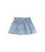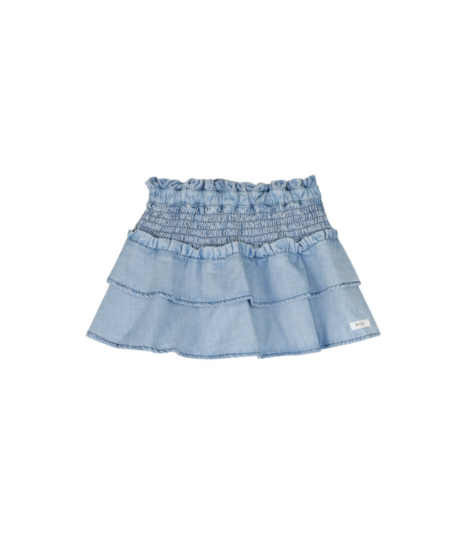 De Yille denimrok combineert een stoere jeanslook met een meisjesachtige, romantische uitstraling. De gelaagde volantjes geven het rokje een speels volume en een vrolijke touch bij elke beweging. Dankzij de elastische, gesmokte tailleband sluit de rok altijd mooi aan en biedt deze volop draagcomfort tijdens het spelen of op een feestelijk moment. De zachte denimstof voelt soepel aan en behoudt zijn moderne, frisse uitstraling, hoe vaak het item ook gedragen wordt. Een onmisbaar basisstuk dat door het eenvoudige maar unieke ontwerp een favoriet item in de kledingkast zal zijn.